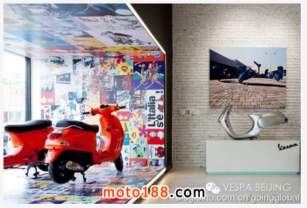Vespa 踏板摩托已經從一個機車品牌上升到了一個文化符號,在都市創意群體的心目中占據著一個特殊的位置。為了迎合這種全球化的消費文化訴求,Vespa在零售領 域積極擴張,比如曼谷這家“Vespa 走廊”品牌店以及未來的許多專賣店。這家店由名為“超級機器”的機構所設計與運營,整家店內標志性的Vespa元素無處不在,從大量的迷你玩具模型展示到 主題墻上那些經典的廣告海報。這基本上就是一場關于Vespa的慶典,強大的時尚潮流足以把一個新人車手帶入品牌文化的社區徜徉。