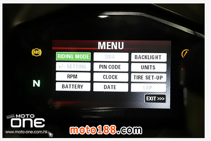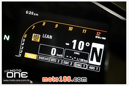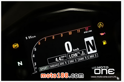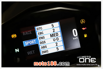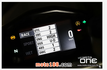 ●彩色屏幕顯示了選用的輔助系統,例如快速電子轉檔(DQS)、循跡系統(DTC)、引擎煞車(EBC),防起頭(DWC)及ABS防鎖死煞車系統等等。