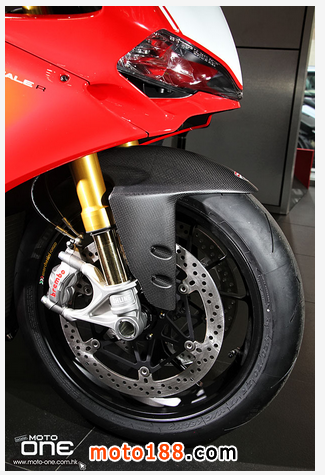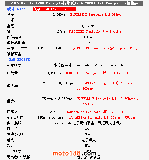 ●2015 Panigale R的引擎來 自1199 SUPERLEGGERA,曲軸混入鎢(超硬物料)物料,比一般版本的曲軸輕396g,另外還配備了1199 SUPERLEGGERA既硬又短的超輕活塞,這兩個部件是維持1,198c.c.排氣同時,卻擠出了205hp馬力因素之一,還有2015 Panigale R版的1,442mm輪距比舊款R版短5mm,尾擔樞軸也降低了4mm,并可讓車主調校角度,方便車手的技師改變車輛幾何角度,尋找更佳高速穩定性或彎向性能。。