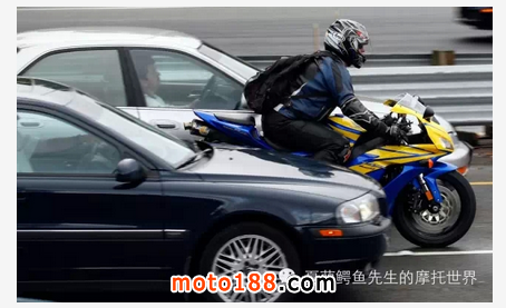 原因很簡單:“摩托車不是汽車,騎士的行為方式也應該和汽車駕駛員有所區別”。摩托車的剎車能力相較于汽車來說很爛,通常一輛頂級的運動型摩托車都要花普通家用轎車三倍以上的剎車距離才能在同等初速的情況停下,和汽車一樣跟車的結果是:前車急剎,而你停不下來;摩托車相較于汽車來說是渺小的,騎士如果不主動出現在汽車的后視鏡里,大部分汽車司機是很難看到在自己正后方有輛摩托車;最后,對于騎士來說,我們唯一一個自身無法避免的來自汽車的威脅是被追尾!當騎士老實跟車的時候,后車撞不撞我們就變成了一件完全取決于后車的事情,騎士無處可逃,無力反抗(汽車大部分情況下被追尾,司機是沒事的,而摩托車則無法保護騎士的安全),極易受重傷。