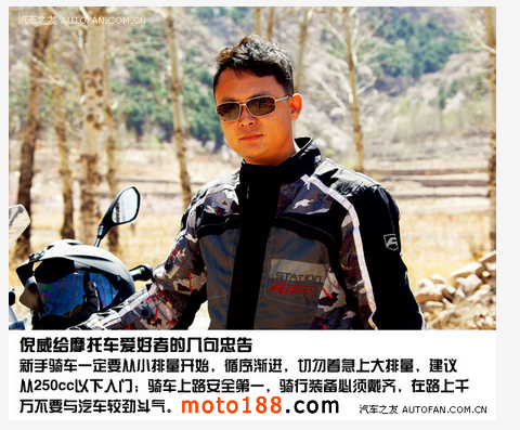 作為我們編輯部里唯一開(kāi)車不被朱熙嫌慢的年輕人,王宇充分地詮釋了后生可畏這個(gè)詞匯的含義。他剛剛考下摩托車駕照,就躍躍欲試并滿懷激情地投身到我們的摩托車大聚會(huì)之中,竟看不出絲毫的膽怯和青澀。假以時(shí)日,當(dāng)他練好本領(lǐng),并能對(duì)摩托車的安全規(guī)則始終報(bào)以敬畏之心且嚴(yán)格遵守,我相信他必能成為一名技藝高超的摩托騎士。