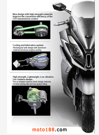 水冷式四沖程單汽缸320.6c.c. OHC 4汽門引擎,偏重于扭力表現(xiàn),2.9kg-m/6,500rpm對(duì)比300i的2.7kg-m/6,500rpm,請(qǐng)大家不要低估那0.2kg-m的扭力 在實(shí)際應(yīng)用時(shí)的差別:放棄了馬力峰值而偏重扭力表現(xiàn)是針對(duì)雙騎的韌力,又或起步、上斜坡至窄路掉頭之類,以並非追求高速表現(xiàn)的車子,30ps/7,750rpm馬力已綽綽有餘。