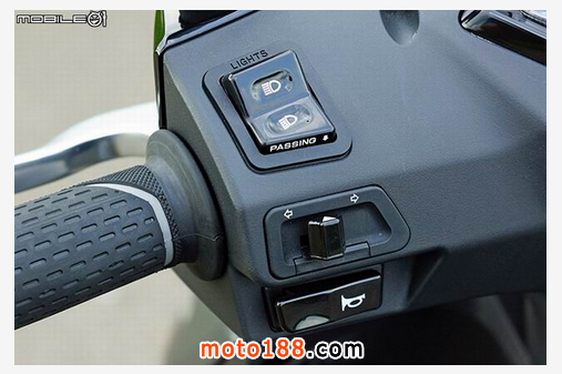 左把手的開關(guān)部分,從上到下分別是遠(yuǎn)燈/近燈/超車燈開關(guān)、方向燈開關(guān)與喇叭按鈕,超車燈采用小型速可達(dá)的設(shè)置方式,騎乘時(shí)若要使用超車燈比較不方便一些。