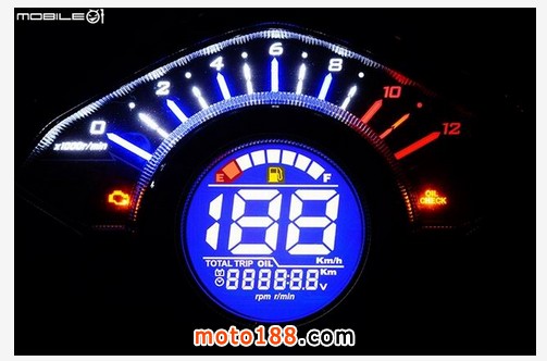儀表板下方的多功能液晶顯示區(qū),除了基本的油量表與時(shí)速表顯示功能外,最底下的部分可以在總里程、單趟里程、機(jī)油使用里程、時(shí)間顯示、電壓表與數(shù)字式轉(zhuǎn)速表進(jìn)行切換,其中最后的數(shù)字式轉(zhuǎn)速表的單位為百位劃分,也就是盡會(huì)顯示百位數(shù)以上差異,如 1100rpm 1200rpm 1300rpm,并無法顯示至 1150rpm 1200rpm 1250rpm 這種較細(xì)的劃分方式。