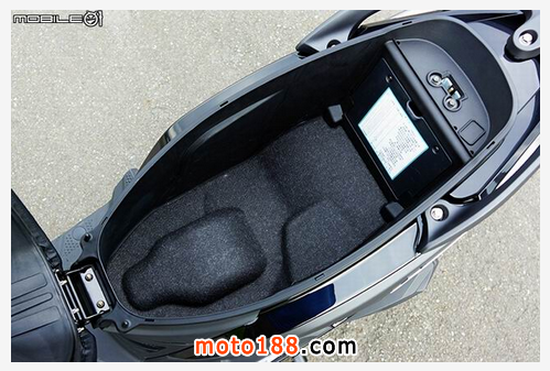 中央置物箱與鎖頭部分,左方的油箱蓋采用新的 SANYANG 商標(biāo),舍棄以往 SYM 的商標(biāo),中央置物空間有特別針對大體積保特瓶進(jìn)行設(shè)計(jì)。