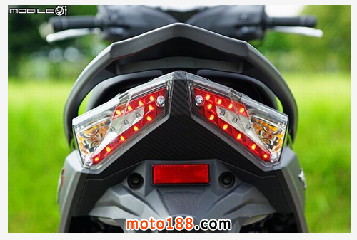 車尾采用大面積的分離式尾燈組,中央更使用類似碳纖維花紋的車殼增加質(zhì)感,尾燈采用單邊 10 顆 共 20 顆的 LED 發(fā)光二極管,并且于中央銀色區(qū)域做明顯的煞車燈分隔,煞車時(shí)除了會(huì)亮起單邊三顆共六顆的發(fā)光二極管外,做為尾燈的 20顆發(fā)光二極管也會(huì)一并加強(qiáng)亮度,借此提升安全性。