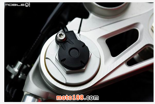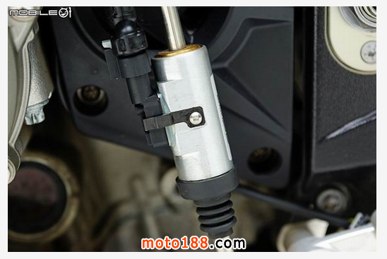 在仿賽車款中必備的前輪防甩頭部分,能避免中高速時因操作錯誤所產生的龍頭甩動失控情況,不過這組防甩頭為手動調整松緊度,并不是由電腦控制的電子式防甩頭,在電子配備滿載的 2015 S1000RR 上獨漏這部分,稍微有些可惜。