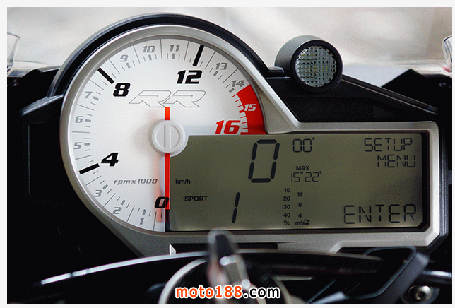 在標準模式下,只要按下左把手的 TRIP 按鈕,就可以在總里程(ODO)、剩余燃油可行駛里程(RANGE)、單趟里程 1/2 (TRIP 1/2)、平均每百公里消耗油量及平均時速等功能進行切換,其中最實用的大概就是剩余燃油可行駛里程,因為 S1000RR 并沒有配置格數油表,所以能夠得知油箱剩余油量的方法大概就屬于這個最可行,而且這個功能顯示的里程數也還蠻準確的,可以做為參考使用。