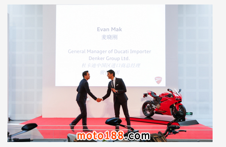 強調了中國市場在杜卡迪亞洲戰略中的重要性,杜卡迪摩托控股公司首席執行官 Claudio Domenicali先生如是說道:“從根本上來講,我們認為中國市場對我們在亞洲的發展無疑非常重要,在此,我們也非常自豪地宣布,借助奧迪的豐富經驗,我們必將不斷壯大前行。同時,我也非常感謝駿新發展有限公司為幫助杜卡迪在中國發展和推動所做的貢獻。我堅信,成為杜卡迪中國的一個重要經銷商后,他們仍將與我們并肩同行,繼續保持以高品質服務和部分經銷商網絡發展所創造的良好勢頭,在行業中樹立標桿。”
