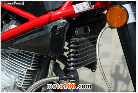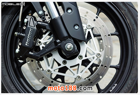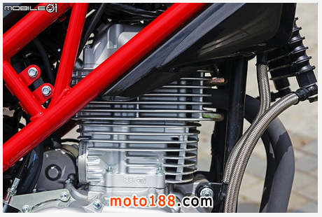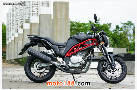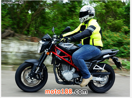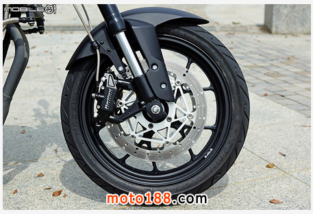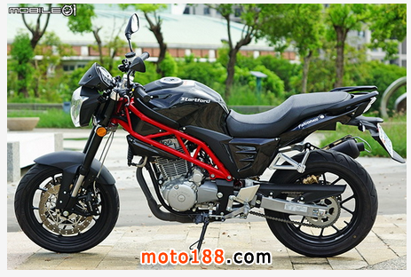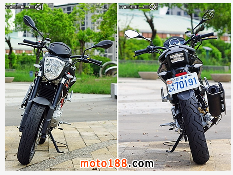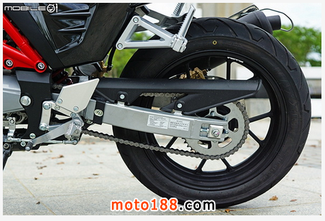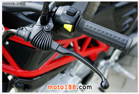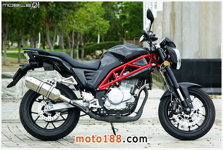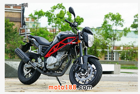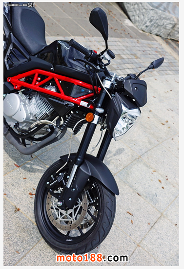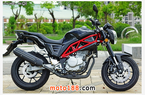 車輛的左側與右側,鋼管編織車臺以紅色烤漆搭配,相信一開始就吸引不少人的目光,接著會看到前避震器使用倒立式前叉與雙碟配置,而且雙碟還采用輻射固定式對向四活塞卡鉗與金屬油管配置,讓人不注意都難,另外后搖臂與輪框造型也算是國產街車中用料與設計都蠻有意思的,厚實鋁合金搖臂與造型更簡約的輪框組,在這個售價之中更顯超值。