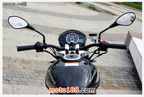 來到騎士視角部分,儀表板的面積不大,不太會占據過多騎乘目光,把手采用寬把設計,騎乘時的騎姿三角還算舒適,上三角臺更采用全鋁合金制成,并且還有鍍鉻拋光設計,在大白天下有像鏡面般的效果,油箱造型也非常好夾,而且腳部會接觸到的地方還是油箱罩而已,略有進口車的設計水平。