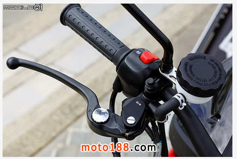 左把手部分,把手尾端并沒有配置平衡端子,左邊的開關配置從上到下分別是遠燈/近燈切換開關、方向燈開關與喇叭按鈕,與大部分的街車并沒有很大差異,很輕松就能上手。