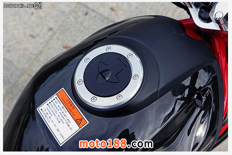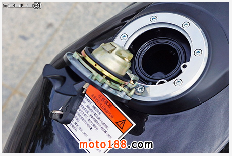 油箱蓋采用免手持設計,加油孔內則因為是全塑鋼油箱緣故,所以看不到以往金屬油箱產生的亮面反光,油箱口與油箱蓋有著互相咬合的氣密橡膠 O 環固定,油氣也比較不容易從此蒸發,下大雨也不用擔心從此處滲水。