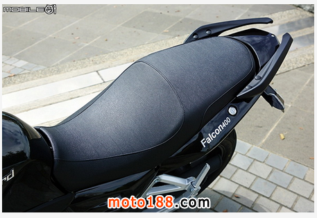 Falcon 400 的坐墊采用前后一體坐墊,與大部分目前新款市售街跑車不太相同,一體式坐墊的外觀雖然沒有前后分離坐墊如此帥氣,但相對來說不論前座或者后座都能有較舒適的乘坐感受,另外哈特佛在皮面方面也有使用沒這么黏的止滑材質,比起全止滑材質會更舒適一點。