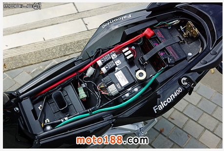 坐墊打開后,底下這些元件就是 Falcon 400 的電控系統以及空濾進氣口、電瓶等位置,至于坐墊打開后是否有置物空間...老實說,這些小空間要說能塞輕便雨衣等當然沒問題,但這個說法還是太牽強,而且電控系統全都在這,實在不建議在這底下狹小的空間還放置物品壓迫電線,要置物空間還是另外安裝后車箱或者掛上軟式側包吧!