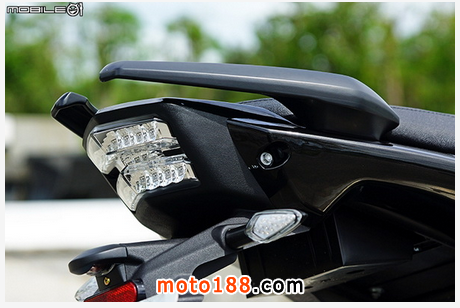 后扶手與尾燈的造型互相呼應,這邊也可以看得出來 Falcon 400 后扶手一邊也僅靠兩個支點固定,在造型上也盡量作到國產檔車不曾作過的設計。