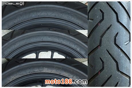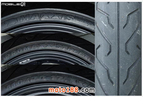 前輪采用 MAXXIS 正新瑪吉斯的 PROMAXXIS STREET 系列輪胎,規格為 110/70-17 M/C 54H,胎紋可以參考右側,這條輪胎在目前國內許多車款都作為原廠配胎,當然這個規格要改換其他性能較好的胎種也沒有問題。