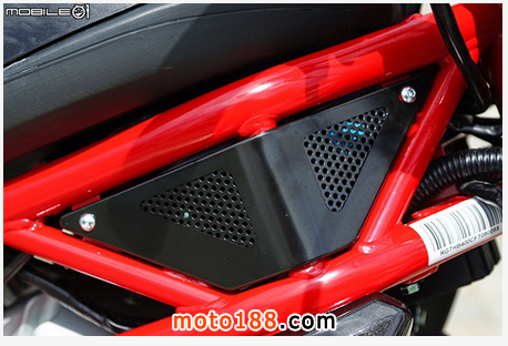 前座下方位置為空濾箱進氣口,不過雖說進氣口在這邊,但是空濾棉更換并不是從這邊打開,而是如同輕檔車大多設計,從車輛側蓋邊打開,才可以看到空濾棉。