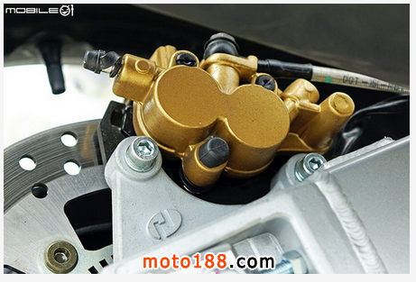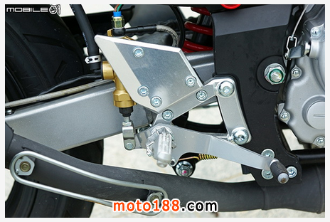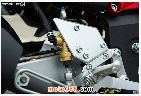 后煞車總泵位于翼型保護塊后方,總泵采用液壓煞車燈開關,可以省去調整傳統彈簧煞車燈開關的彈簧張力的問題,并且后煞車也采用金屬油管,省去一筆改裝費用,也增加耐用程度。
