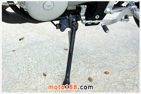 側柱部分使用金屬側柱,并且側柱座上可以看到前端有側柱安全開關,入檔時將側柱放下即會熄火,并且在入檔時也無法在側柱未收時按離合器發動引擎,需將側柱收起才可發動。