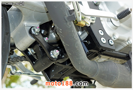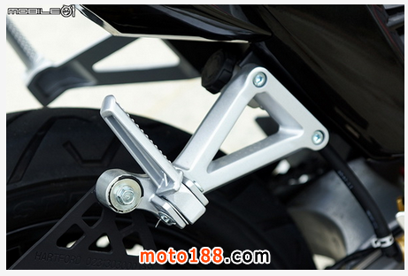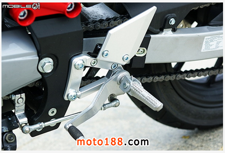 左側角踏及打檔桿部分,變速箱采用國際五檔配置,當然左腳踏翼形護塊也是采用鋁合金材質制作,打檔桿的打檔順暢度也還不錯,空檔不算難找,但是一檔并未像他廠國際檔車款設計檔銷,因此進入一檔后若繼續踩踏打檔桿,踩踏行程會讓人誤以為還有檔位可以降而繼續踩踏打檔桿。