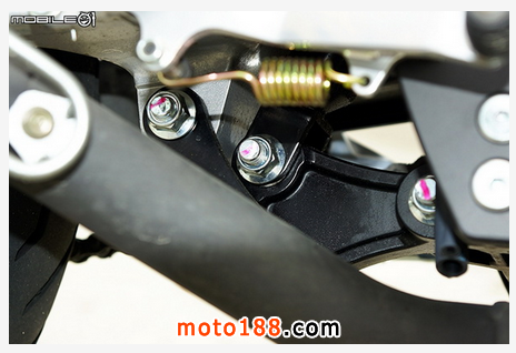 接著看到后搖臂下方避震器座的部分,原以為可能跟大多數國產中置避震的檔車一樣,直接鎖在搖臂上而已,結果卻令人意外的有搭載多連桿后避震??!中置后懸吊系統加上多連桿避震器緩沖,更是增添避震器的運作效率,同時也讓騎乘感受會更為優質與穩定。