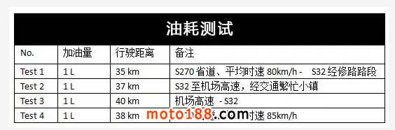 為了更準確地測試實際行駛中的油耗,我們在出發前抽空摩托車郵箱,并加注1L燃油。MARCO在保持約80km/h的平均速度騎行45公里后耗完第一升油。緊接著加注的第二升油行駛了47公里,第三升油行駛了50公里,第四升油行駛了48公里。LYRA再次突出地表現出了彎梁車“省油”的優越性。