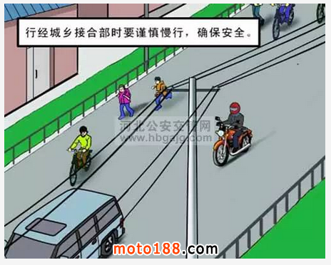 (2)行經城鄉接合部時,要考慮各種危險因素,行車中注意觀察路邊的行人、非機動車、農用車、大型貨車和路邊的攤位等,要有耐心、少鳴喇叭,并控制好車速;遇行人或者非機動車突然橫穿道路時,要及時減速或停車避讓。
