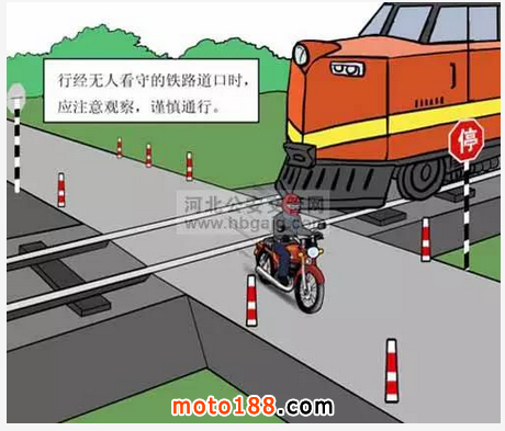 (4)行經無人看守的鐵路道口時,應做到“一停、二看、三通過”,禁止在道口內停車;行經有人看守的鐵路道口時,應服從道口管理人員的指揮,在欄桿開始下降時,禁止強行闖桿,與火車搶行。
