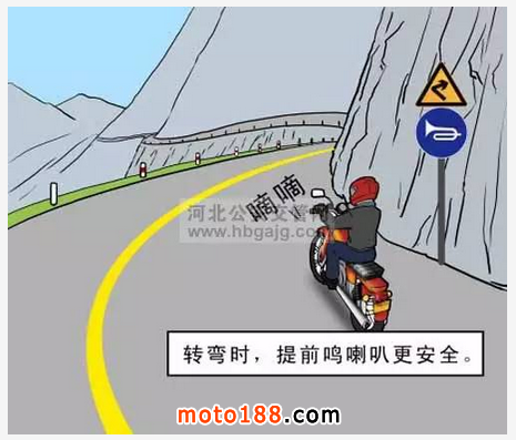 (5)行經彎多、彎急的山區道路時,要降低車速,緩慢轉彎,避免占用對向車道,并提前鳴喇叭。下坡時應使用低擋輔助制動,以后剎車為主,前剎車為輔,隨時控制車速,不要空擋滑行,不要長時間使用剎車,以免剎車片因過熱而失靈。