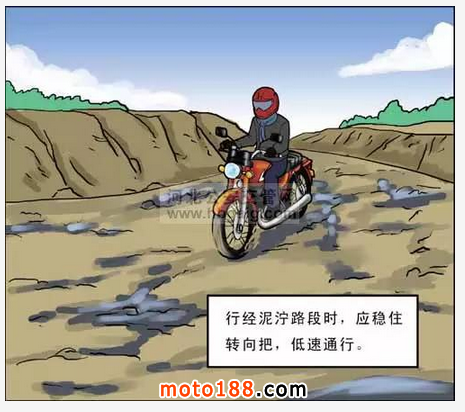 (6)行經泥濘路段時,應選用適當擋位,保持足夠的動力,穩住轉向把,均勻一次性通過。通過長泥濘路段時,應中途停車熄火休息,以防止發動機溫度過高。通過泥濘路段時,應停止加油,必要時下車推離泥濘路段,否則車輛會陷入泥潭,不斷打滑。