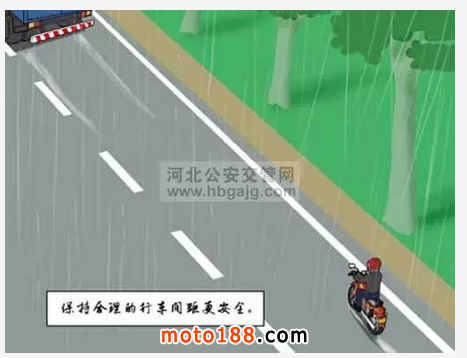 在濕滑路面上行車,剎車距離會增加80%以上,因此要保持更大的行車間距。如正在高速公路上行駛,則應在確保安全的情況下盡快駛離高速公路。