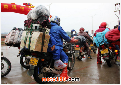 1月26日,廣西梧州市出現寒潮陰雨天氣,氣溫降至6℃左右,寒風刺骨,眾多返鄉“鐵騎大軍披著雨衣,穿著水鞋在寒風冷雨騎行。他們的手、腳會逐漸因溫度過低而麻木,旅程十分艱險。