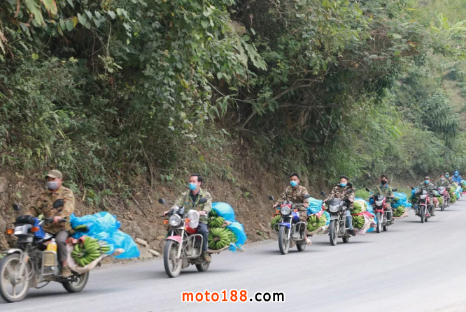 村民騎著摩托車把香蕉從村里載運到公路上。本文圖片 劉恒 圖