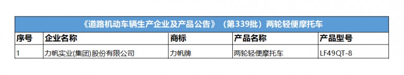 第339批公示兩輪輕便摩托車品牌包括:力帆牌,能上牌的1款產品型號見圖2。