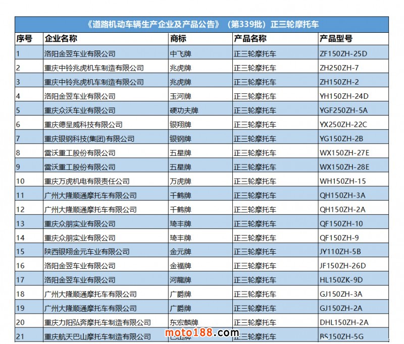 第339批公示的正三輪輕便摩托車品牌包括:中飛牌、兆虎牌、玉河牌、硬功夫牌、銀翔牌、銀鋼牌、五星牌、萬虎牌、千鶴牌、琦豐牌、金元牌、金福牌、河龍牌、廣爵牌、東宏麟牌、巴山牌,能上牌的21款產品型號見圖3。