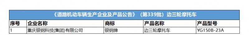 第339批公示的邊三輪摩托車品牌包括:銀鋼牌,能上牌的1款產品型號見圖4。