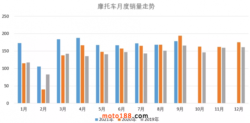 由于疫情,去年春季摩托車銷量受挫,直到9月份的金秋時節,摩托車單月銷量才達到全年最高值,今年行業回春,第一季度就有3個月份的銷量可以排進去年第二,而今年9月全國摩托車銷量雖然環比8月依然有5.2%的增長。