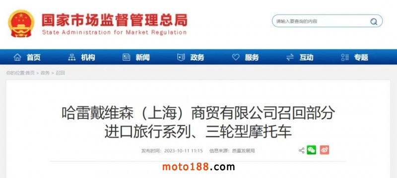 核心提示:10月11日,據國家市場監督管理總局公告,日前,哈雷戴維森(上海)商貿有限公司根據《缺陷汽車產品召回管理條例》和《缺陷汽車
