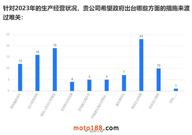 針對(duì)2023年的生產(chǎn)經(jīng)營(yíng)狀況,企業(yè)希望政府出臺(tái)的主要措施有:降低企業(yè)稅費(fèi)(22.5%)、保持人民幣匯率穩(wěn)定(18.6%)以及出口信用保險(xiǎn)(15.7%)等方面。