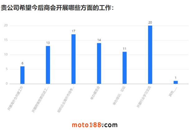 今后,開展行業(yè)學(xué)習(xí)交流(24.7%)、組織企業(yè)進(jìn)行海外市場(chǎng)考察(21%)及舉辦行業(yè)展會(huì)(17.3%)等活動(dòng),是企業(yè)希望商會(huì)能重點(diǎn)開展的工作。