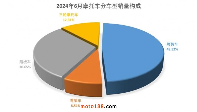 1-6月,跨騎車產(chǎn)銷464.78萬輛和461.75萬輛,同比增長21.95%和20.03%;踏板車產(chǎn)銷285.3萬輛和291.71萬輛,同比下降34.55%和27.28%;彎梁車產(chǎn)銷82.53萬輛和81.03萬輛,同比增長4.45%和2.82%。從各車型銷量占二輪車總銷量的比重看,跨騎、踏板和彎梁三類車型占比分別為55.33%、34.96%和9.71%。