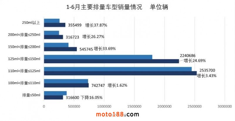 1-6月,全行業(yè)完成燃油摩托車產(chǎn)銷789.64萬輛和788.37萬輛,同比增長11.29%和10.27%;電動摩托車產(chǎn)銷159.51萬輛和163.28萬輛,同比下降47.01%和38.39%。1-6月,共產(chǎn)銷摩托車949.16萬輛和951.65萬輛,同比下降6.07%和2.89%。其中,二輪摩托車產(chǎn)銷832.6萬輛和834.49萬輛,同比下降7.08%和3.49%;大排量休閑娛樂摩托車(排量250cc以上,不含250cc)產(chǎn)銷35.27萬輛和35.55萬輛,同比增長41.93%和37.84%。三輪摩托車產(chǎn)銷116.55萬輛和117.16萬輛,同比增長1.79%和1.63%。
