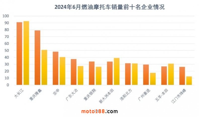 1-6月,燃油摩托車銷量前10名企業(yè)(集團)為大長江、隆鑫、宗申、廣東大冶、重慶銀翔、新大洲本田、洛陽北方、廣州豪進、五羊-本田、江門市珠峰,10家企業(yè)共銷售摩托車438.17萬輛,占摩托車總銷量的55.58%。