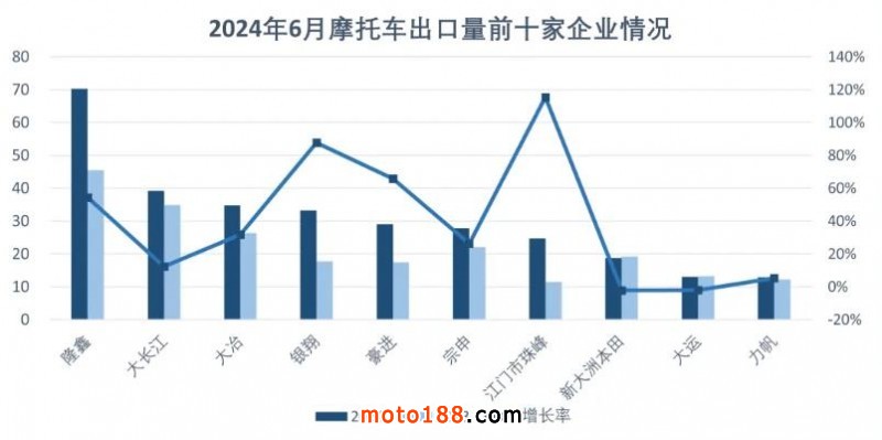 1-6月,摩托車出口量排名前十位的企業(yè)依次為:隆鑫、大長江、廣東大冶、重慶銀翔、廣州豪進、宗申、江門市珠峰、新大洲本田、大運、力帆,上述十家企業(yè)共出口303.83萬輛,占摩托車出口總量的58.99%。