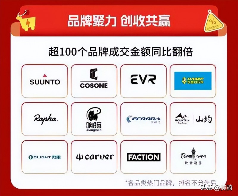 超過100個品牌成交額同比翻倍,其中騎行品牌最熱門的包括中高端國產騎行服品牌EVR,和高端騎行服品牌Rapha。整車國產品牌坎普自行車成交額在這個周期同比也直接翻倍。