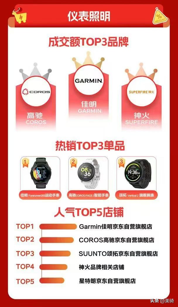在儀表照明榜單上,自行車碼表老大哥佳明在此位居榜首,雖然主要銷售額并非由碼表貢獻。另外,位居第二的高馳的產品線中也有自行車碼表的一席之地。
