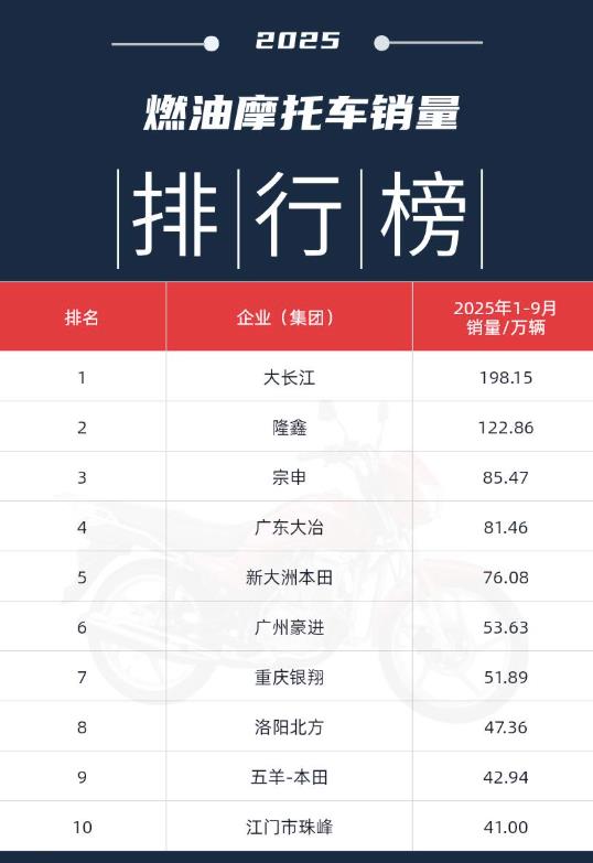 在燃油摩托車市場的增長中,頭部企業發揮了關鍵作用。2025年1-9月,大長江、隆鑫和宗申位列銷量前三甲,其中大長江集團以198.15萬輛的累計銷量穩居榜首。生產的豪爵和SUZUKI兩大品牌摩托車,不僅暢銷國內,而且出口到80多個國家和地區。其燃油摩托車銷量,已經連續22年全國排第一。