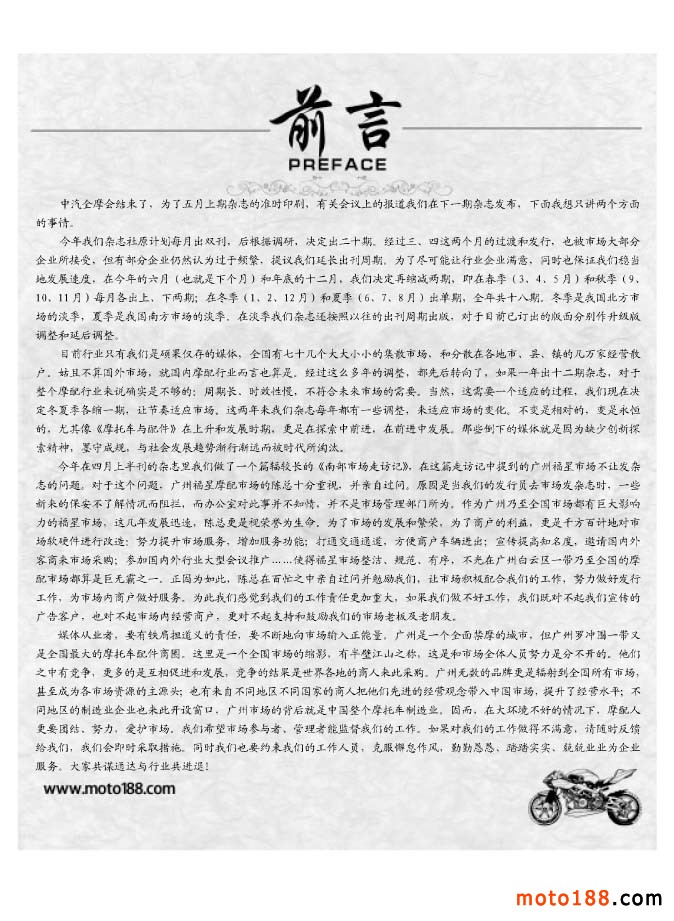 目前行業(yè)只有我們是碩果僅存的媒體,全國(guó)有七十幾個(gè)大大小小的集散市場(chǎng),和分散在各地市、縣、鎮(zhèn)的幾萬(wàn)家經(jīng)營(yíng)散戶(hù)。姑且不算國(guó)外市場(chǎng),就國(guó)內(nèi)摩配行業(yè)而言也算是。經(jīng)過(guò)這么多年的調(diào)整,都先后轉(zhuǎn)向了,如果一年出十二期雜志,對(duì)于整個(gè)摩配行業(yè)來(lái)說(shuō)確實(shí)是不夠的:周期長(zhǎng)、時(shí)效性慢,不符合未來(lái)市場(chǎng)的需要。當(dāng)然,這需要一個(gè)適應(yīng)的過(guò)程,我們現(xiàn)在決定冬夏季各縮一期,讓節(jié)奏適應(yīng)市場(chǎng)。這兩年來(lái)我們雜志每年都有一些調(diào)整,來(lái)適應(yīng)市場(chǎng)的變化。不變是相對(duì)的,變是永恒的,尤其像《摩托車(chē)與配件》在上升和發(fā)展時(shí)期,更是在探索中前進(jìn),在前進(jìn)中發(fā)展。那些倒下的媒體就是因?yàn)槿鄙賱?chuàng)新探索精神,墨守成規(guī),與社會(huì)發(fā)展趨勢(shì)漸行漸遠(yuǎn)而被時(shí)代所淘汰。