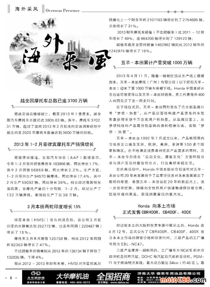 目前行業只有我們是碩果僅存的媒體,全國有七十幾個大大小小的集散市場,和分散在各地市、縣、鎮的幾萬家經營散戶。姑且不算國外市場,就國內摩配行業而言也算是。經過這么多年的調整,都先后轉向了,如果一年出十二期雜志,對于整個摩配行業來說確實是不夠的:周期長、時效性慢,不符合未來市場的需要。當然,這需要一個適應的過程,我們現在決定冬夏季各縮一期,讓節奏適應市場。這兩年來我們雜志每年都有一些調整,來適應市場的變化。不變是相對的,變是永恒的,尤其像《摩托車與配件》在上升和發展時期,更是在探索中前進,在前進中發展。那些倒下的媒體就是因為缺少創新探索精神,墨守成規,與社會發展趨勢漸行漸遠而被時代所淘汰。
